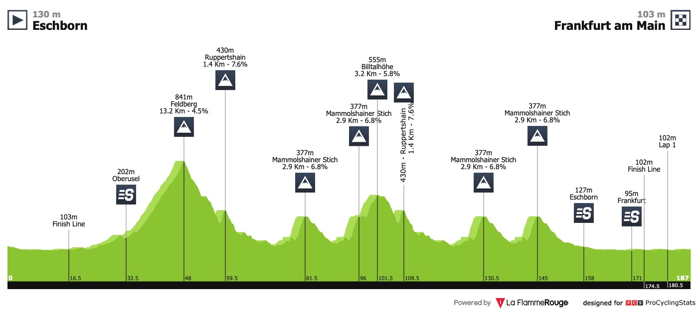 The 58th edition of Eschborn-Frankfurt contains more difficulties than before, spread over 187.5 kilometers and more than 3,200 meters in elevation. The Taunus loop and a more demanding finale in Frankfurt provide even greater challenges - with an exciting new final circuit along the Main river with a spectacular view on Frankfurts skyline. Some of the legendary climbs from the history of the race will make a comeback: the hill in Ruppertshain (1.3km, ø6.7%) has to be climbed two times, the Billtalhöhe (3.5km, max. 8.4%) is included one time after its great comeback last year. Besides these innovations, the well-known challenges like the long ascent to the Feldberg (10.8km, ø5.0%) at the end of the first race hour and the steep Mammolshainer Berg (1.0km, max 23.0%), which will be climbed four times, are on the menu of Eschborn-Frankfurt. The departure time is at 12.10pm, the expected arrival time in Frankfurt is 4.50pm.