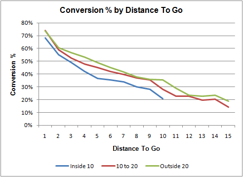 For example, a 4th down and 3 at the 50 yd line could be converted 56% of the time.