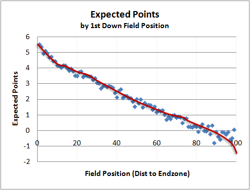 Further, from that article, such a successful conversion (after starting with a 4th & 15 from the 35 yd line) would put the ball on at least the 50 yard line, which would result in 1.8 "expected points" (based on data from 2,400 NFL games from the 2000-2008 seasons). But expected points increases the closer to the endzone a team gets. So, lets say the 4th & 15 conversion nets a 30-yard gain, putting the ball on the defenses 35 yard line. The expected points from that ball spot would be close to 3 points. One could go through lots of mental gyrations over this.