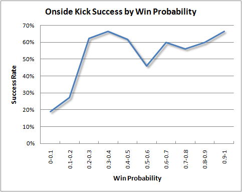 The effect of surprise on the success of an onside kick is pretty big. The chart below plots success rate by WP. The less a team is expecting an onside kick, the more successful it is. When teams are expecting it, when WP is about 0.15 and below, the success rate is about 20%. But when teams aren’t expecting it, the success rate averages 60%. (There are 103 onside kicks classified as 'surprise' in the data, which results in a standard error of +/- 4.8%.)