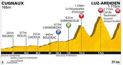 Luz Ardiden is actually rather a borderline case when it comes to HC categorization, being around the same kind of stats as Alpe d'Huez but slightly less steep (just under 7,5% as opposed to just under 8%) and, for a climb of that kind of categorization it is relatively straightforward. It's certainly not as hard a climb as the Col du Tourmalet. However, it IS a mountaintop finish, it IS borderline cat.1/HC and it has had the HC categorization in every edition of the Tour it has been featured in, so I go with that. This stage, even if raced conservatively in line with the not dissimilar 2011 profile, should result in time gaps and mean that there's something to protect. It should eliminate the pretenders from contention, and it should also mean that the big GC guns have to consider taking the maillot jaune early in the race, which may have an effect when they come to the final week, as they would likely rather not hold on to the jersey and expend too much effort defending it this early on; however, there are no more HC/cat.1 climbs for some time now, so they don't want to pass up the opportunity to take time on their rivals, especially as this is the ONLY Pyrenean stage, and the route is hardly swimming in Alps either (as you can probably guess from the fact there are no climbs higher than the Tourmalet in the race)...