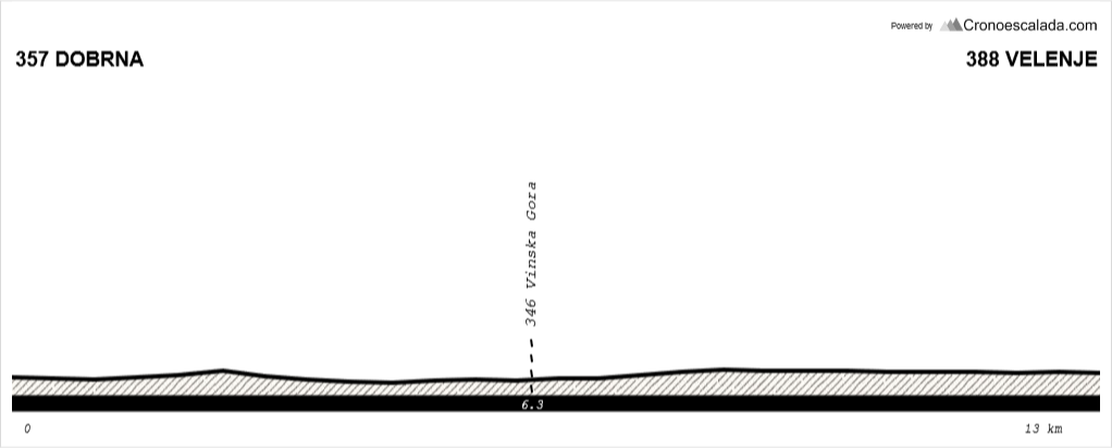 The riders have an easier section of 2 km, although there is a very short 14% downhill part. The penultimate climb to Podgorje starts, it's just 530 meters long but 9,3% steep. After the descent, the final 'climb' starts, it's nothing more than a 200 m long 10% ramp. It will take the riders about 40 seconds.