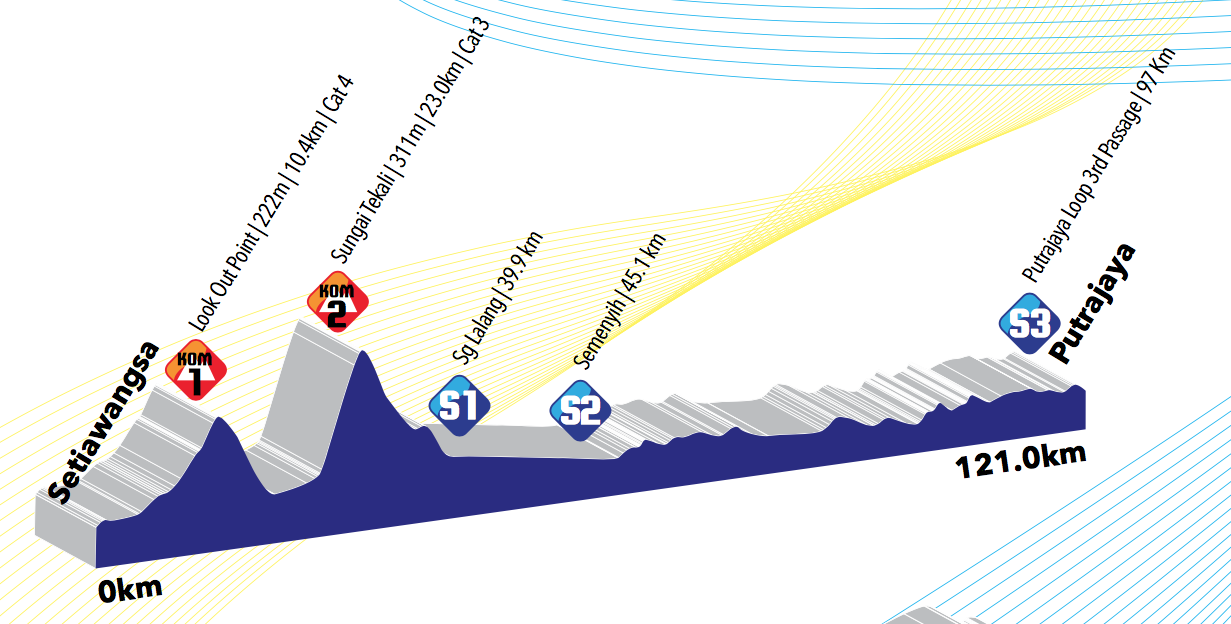 This stage is not a long one, and it’s not a super hard one, but it’s also, as mentioned, a lot more complex than we usually get on the final day in Langkawi. After heading into Cheras, we turn northeastward to head into the foothills of the Titiwangsa mountains, and include a couple of climbs in the first half of the stage. The map might make it look like we loop back on ourselves, but we don’t actually cross the race route - we turn right in the town of Hulu Langat shortly before the junction where we will approach on the same road from the north and turn right later, so the route almost reaches itself but doesn’t quite cross over.