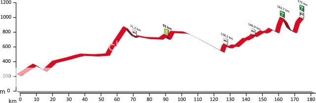 A rolling stage that starts of with a 2nd category climb, but avoiding as much as possible any decent climb. The last 500m are at 4.5% uphill, and from 1.5 to 1km to go there is an 8% uphill drag, so probably not really something for the pure sprinters.