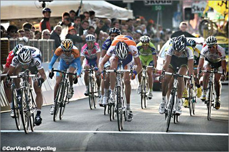 Giant Cav sitting up, Freire still pedalling with his head under everyone's chin, Zabel lunging...
