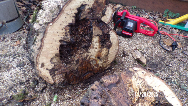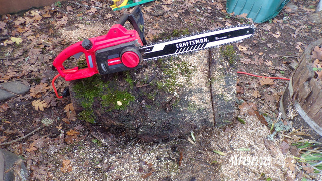 Obviously I won't return my cheapy 12" because I've invested too much time and effort into it (and it still works!), but I still need to cut up those tree limbs I had just felled recently. So I've upgraded once again, and this time to a 16" - I don't mind that it's corded because all I'm trying to do is cut the huge limbs into smaller pieces. But this one I'm posting a picture of proves a challenge not because it's so huge, but because it's filled with red ants! So I'm just cutting a piece of lumber at a time while also spraying some ant spray on the little ***...