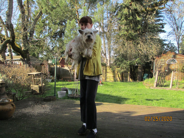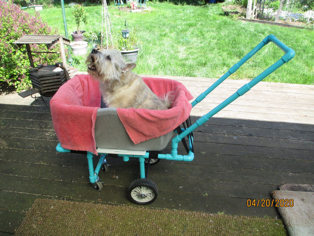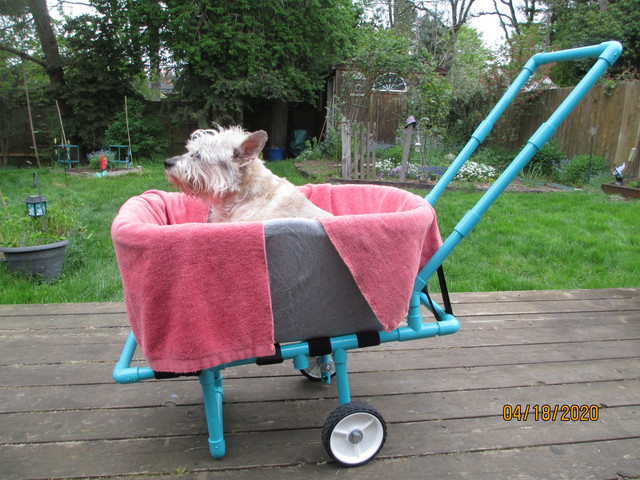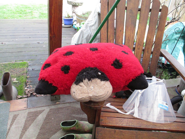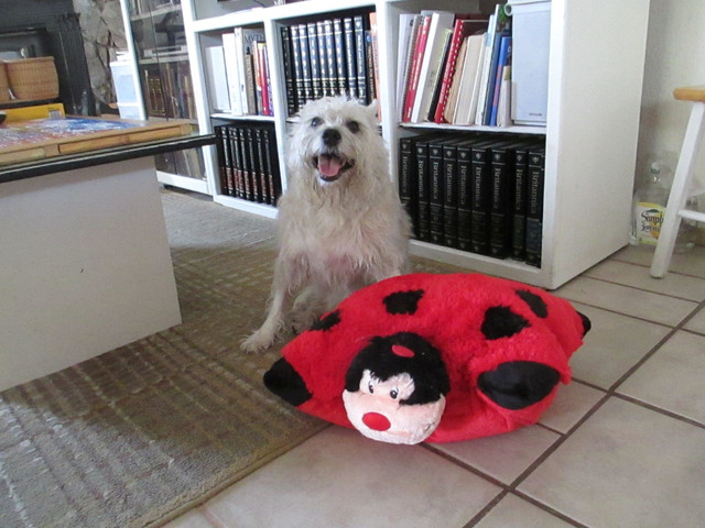 In this pic Toby had just gotten back from a walk, so he's a little pooped out. So maybe he'll be using ladybug as a pillow (as intended) instead of ripping her face off... nah, I'm sure he'll rearrange her eventually.