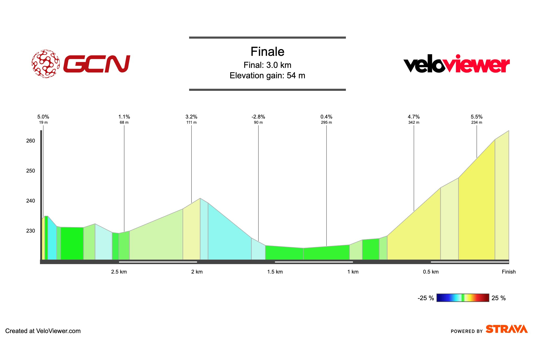 Here the road kicks up in earnest, but only at a little over 4% on average, and it isn't irregular. At about 60-70 metres from the line, the gradient somewhat tapers off.